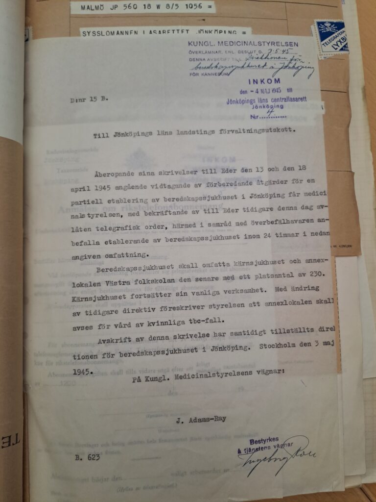 Sedan mars 1945 pågick Svenska Röda korsets expedition med de ”Vita bussarna”. Det stora antal överlevare som räddades behövde vård. Den 3 maj 1945 utgick därför order från Kungl. Medicinalstyrelsen om att upprätta ett beredskapssjukhus i Jönköping. Sedan 1940 fanns det planer för att kunna upprätta beredskapssjukhus som komplement till ordinarie vård ifall kriget skulle komma till Sverige. Västra skolan var en av lokal som ansågs som lämpligt för detta ändamål. Nu kom aldrig kriget till Sverige men likväl dem som utsattes för krigets konsekvenser.