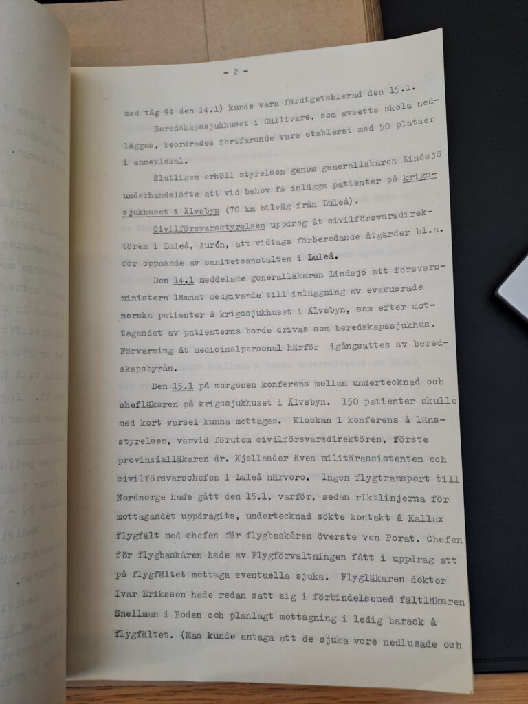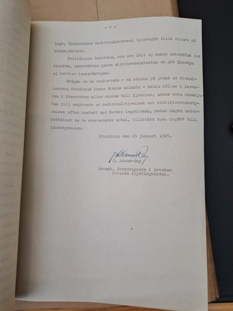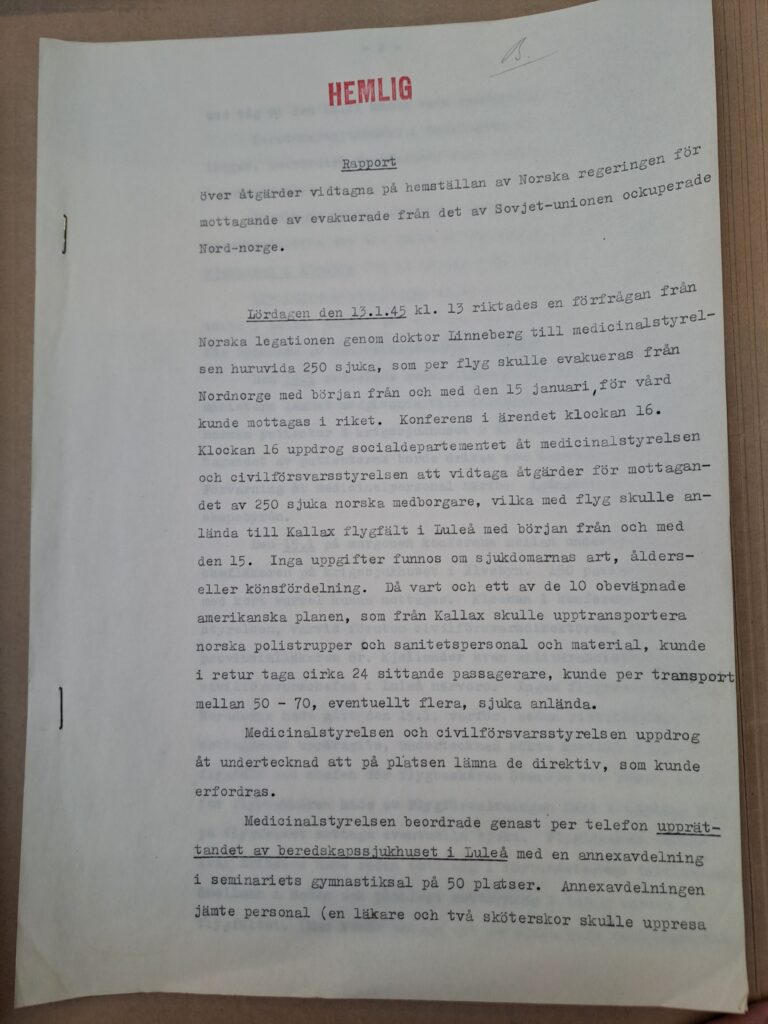 I arkiven är det möjligt att hitta spännande dokument som inte har läst eller setts av någon annan tidigare. Som denna rapport med orden ”HEMLIG” längst upp. Rapporten låg i en arkivbox från Medicinalstyrelsens arkiv. Den beskriver arbetet med att förbereda vård för norska medborgare som kunde behöva evakueras från Nord-Norge 1945.